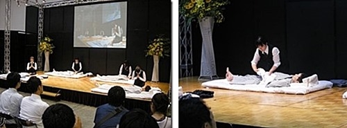 死人役が浴衣で寝かされていて、納棺師が美しく、優雅に着替えさせるのを競う。