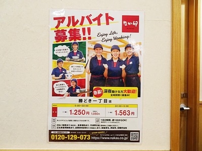 私は既に家で済ませていて2人と一緒に食べないので、なんとなく店内のポスターに目が行った。そのポスターを見ると、最近のアルバイトの日当は予想以上に高くなっている。昼間の時間帯で1時間1250円、午後10時以降は1563円だった。