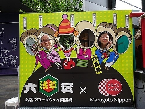 六区で「顔ハメ」をする2人。