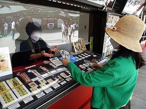 浅草寺の授与所で「お守り」を3種類買うニエンさん