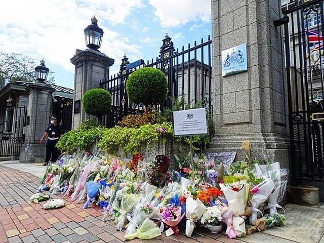 正面入口の立て札をみたら『記帳は午後2時からです』とあり、この日が最終日なので昼前から待っている人達だった。門前には大量の花束が積まれ、多くの弔問者が来ていることが分かる。時々、大使館ナンバーの車が敷地内に入って行く。
