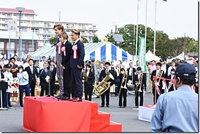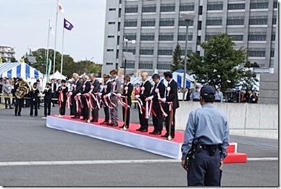 午前9時になり、赤毛氈が敷かれた仮舞台にお偉方が並び、司会者に紹介される。