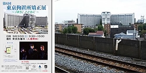 東京拘置所矯正展のポスター。   小菅駅ホームから巨大な拘置所の建物が見える。