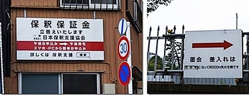 拘置所への道には面白い看板が出ている。     「面会 差入れは・・」 「保釈保証金」の立替屋もある。