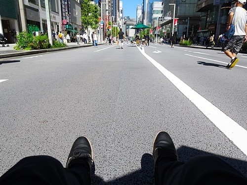 銀座通りの歩行者天国に置かれたパイプ椅子に座って時を過ごす私。
