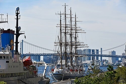 タグボート2隻と「日本丸」がレインボーブリッジの方へ近づいて来た。