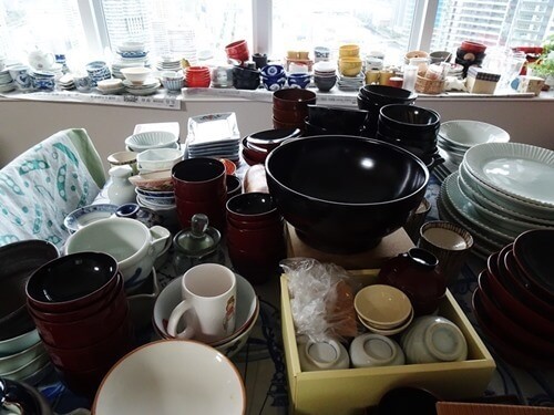 蛍光灯の取り付けと配線の為に、台所の吊戸棚の中の食器類を全て出さねばならなくなった。それらを女房は棚から出して、テーブルや窓際などに置いていたが置き切れない。あまりに多く、また中には高価な物もあるらしく、記念撮影をしたのである。