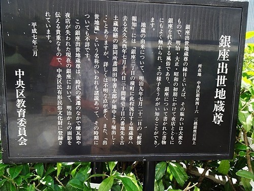 出世地蔵尊の由来に諸説があるが、『明治時代に現在の銀座4丁目10番あたりから掘り出されたと言われている。このお地蔵さまが銀座4丁目の空き地に祀られると、次第にお詣りする人が増え、やがて縁日も開かれるようになった。