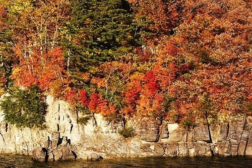 湖の岸辺では赤い紅葉も見られた。