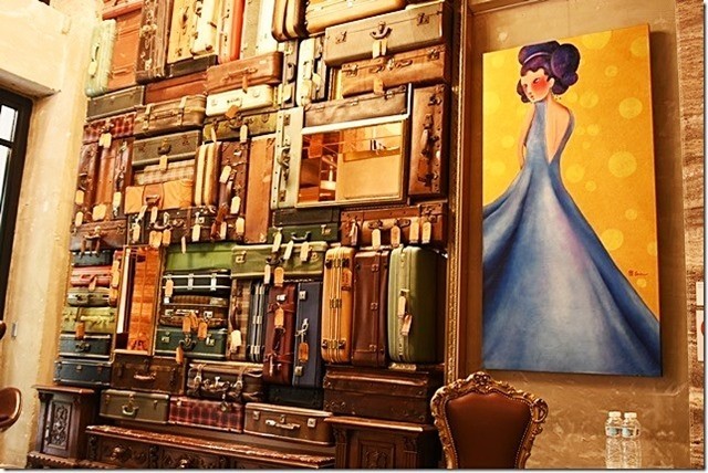 台中で泊まった「Blue Sky Hotel」 お洒落なデザイナーズ・ホテルは古さんが予約してくれた。      入口を入ると天井まで、古いトランクが積み上げられている。