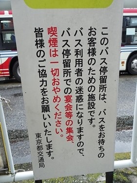 『このバス停留所は、バスをお待ちのお客様のための施設です。バス利用者の迷惑になりますので、バス停留所での宴会等の集会、喫煙は一切おやめください。皆様のご協力をお願いいたします』。