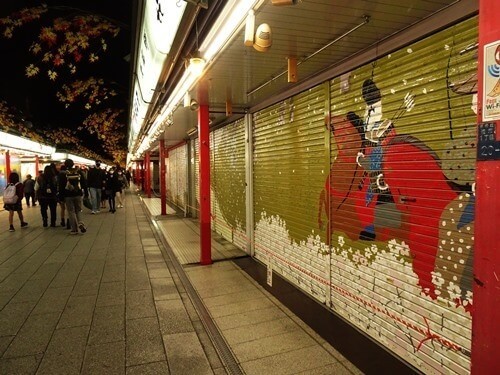 提灯の下を通り過ぎて、仲見世通りに進む。両側の店は全てシャッターが下りている。