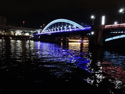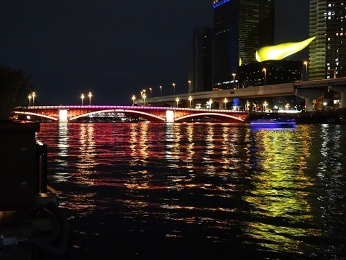 駒形橋の照明が隅田川の水面を怪しく照らしている。