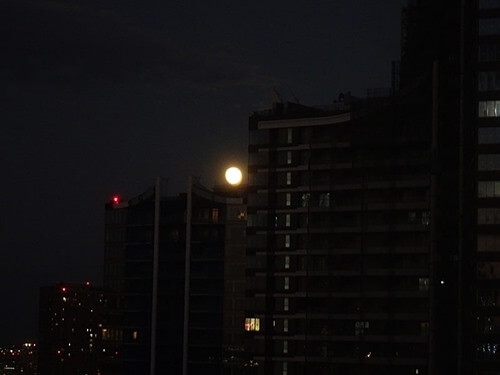また暗くなって来て空を見たら、隣の建設中のマンションの上に満月が出ていた。