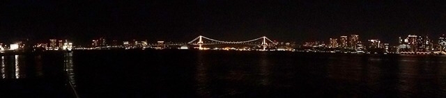 豊海水産埠頭からレインボーブリッジを含むパノラマで見る。