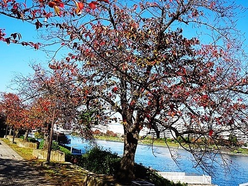 以前からXさんもYさんも、『どこかに紅葉の写真を撮りに行きたいですねー』と言っていたのを思い出した。そこで日本橋に行く途中に船から見た「リバーシティ21」の隅田川沿いの桜の木の紅葉撮影を誘った。