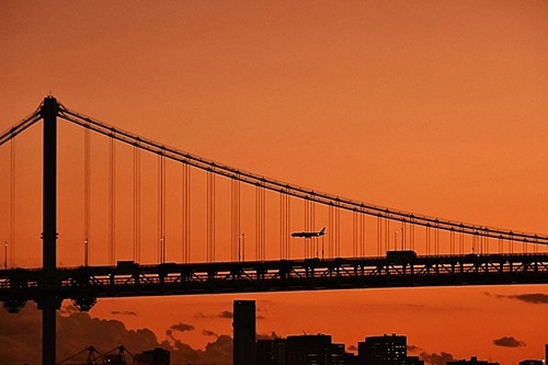 西の方角から飛んで来て羽田空港に向かう飛行機が、レインボーブリッジの上を通過して行く。航路か航空機の大きさかは不明だが、ここから見ていると飛行機が橋の中を飛ぶように見える時もある。