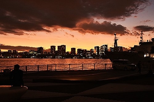 夕方になり、「今日は夕焼けが綺麗に出そうだ」と思い、晴海埠頭公園に行ってみることにした。家から歩いて10分ほどで、晴海埠頭の先端に着く。