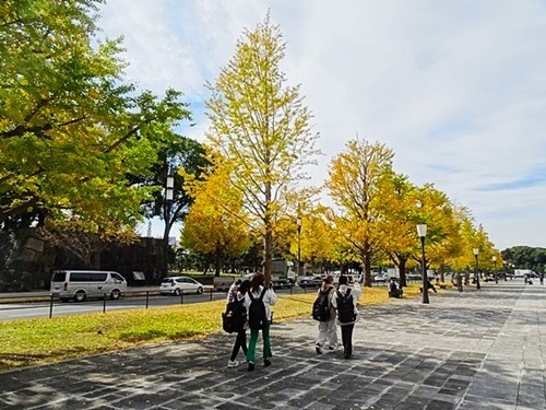 和田倉門の交差点を左に曲がると、そこは東京駅から続く行幸道路で両側にイチョウ並木が続く。この道路は広く左から「歩道」、「車道」、「銀杏並木」、「広い歩行者専用道路」、「銀杏並木」、「車道」、「歩道」となっている。多くの人達は中央の道路をブラブラしながら歩いている。
