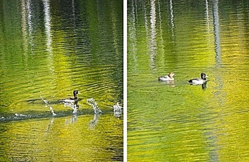 皇居のお堀で水面に反射したイチョウの中で遊ぶ鴨たち。