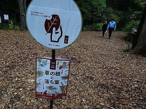 入口を入ると看板があった。いまの時期のお勧めは「草の根と落ち葉」のようだ。