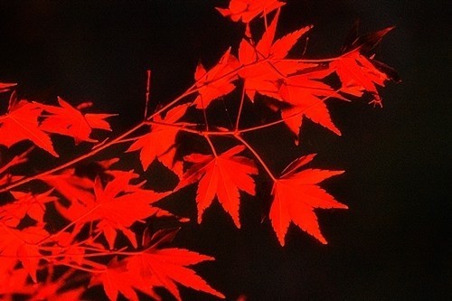しばらくの間、緋毛氈の敷かれたベンチに腰掛けて待っていたら、一斉にライトアップが始まった。薄暗い中で光が当たったところだけ、真っ赤になった。