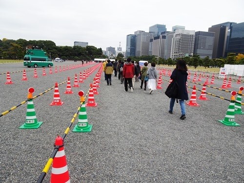 皇居前広場に行くと、例年のように並ぶために紅白のカラーコーンで列が仕切られていた。しかし今回はそんな必要は無く、1列で立ち止まらないでも前に進めた。