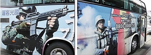 バスの横腹に書かれた軍隊の隊員募集広告。