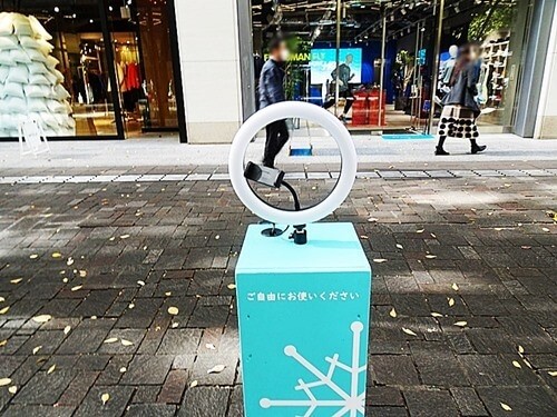 スタンドのアームにスマホをセットすると、丸い穴の周囲から明りが点いて自分が写せる仕掛けらしい。私はやってみたかったが、人が大勢いたので恥ずかしくて止めた。