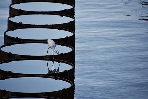 運河にやって来るサギが、満潮時に護岸用のパイルの中に取り残された小魚を狙っている。