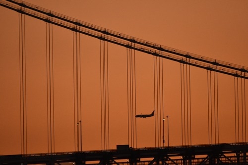冬の早い夕暮れの夕焼けの中をレインボーブリッジの向こう側を羽田空港に向かう航空機。