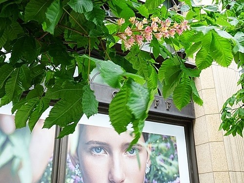 ペニンシュラ・ホテルの横の歩道に植えられたマロニエの花が咲いた。 ホテルの壁のショーウィンドーの女性があなたを見ている。