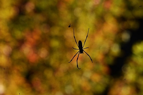 神奈川県の民家園で、藁ぶき屋根から降りて来た蜘蛛が紅葉の中で獲物を狙う。