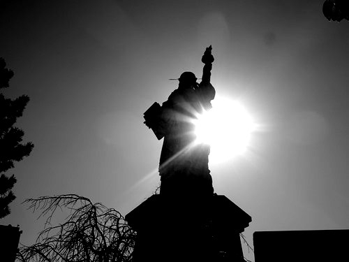 お台場海岸近くに立つ「自由の女神」が逆光の中で光っている。(モノクロでアート風にしてみた)