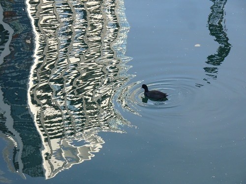 鏡面のような運河を泳ぐ水面がビルさえも揺らす。