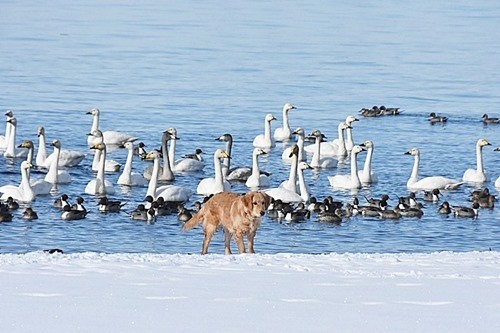 近所の人が犬の散歩で来ていたが、犬が近付いても白鳥は逃げない。