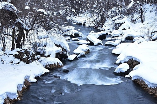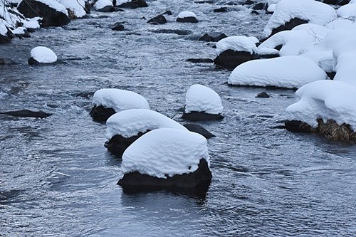 そして橋の上から、岩に積った雪の川を撮影するのである。