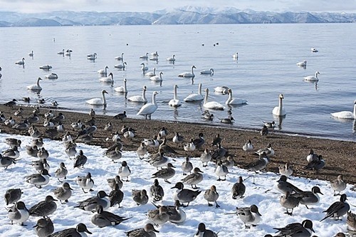 志田浜に行ってみたら、凄い数の白鳥と鴨が岸辺の近くで遊んでいた。