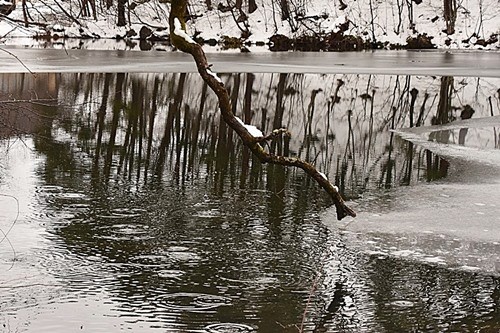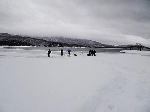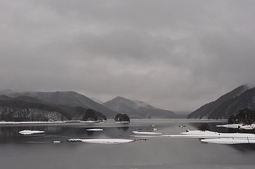 空は暑い雲に覆われていて、湖面は岸辺近くは氷が張っている。