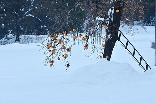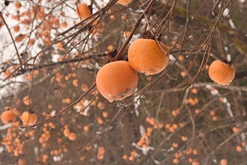 雪の中に赤黄色の柿は絵になるが、食べない理由は帰って来てから分かった。