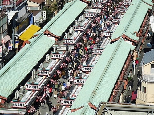 あまりに人出が多いので、雷門の向かいにある浅草文化観光センターの8階に上り、そこから仲見世通りを見た。雷門前も、仲見世通りも人で埋まっていた。