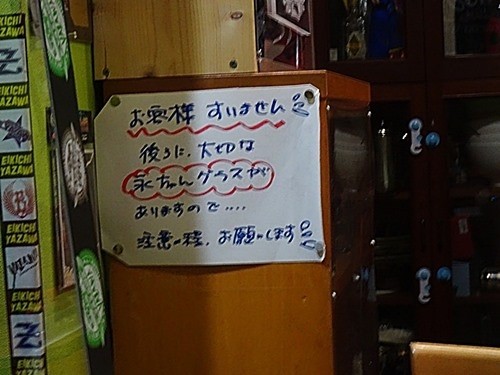 向かいの壁には「お客様 すいません。後ろに大切な永ちゃんグラスがありますので注意の程、お願いします」という張り紙があった。