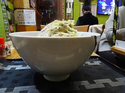 丼ぶりが大きい上に、深い。13センチはある。その丼ぶりの縁より上に野菜が突き出ている。見ただけで「これは食べ切れない」と感じた。