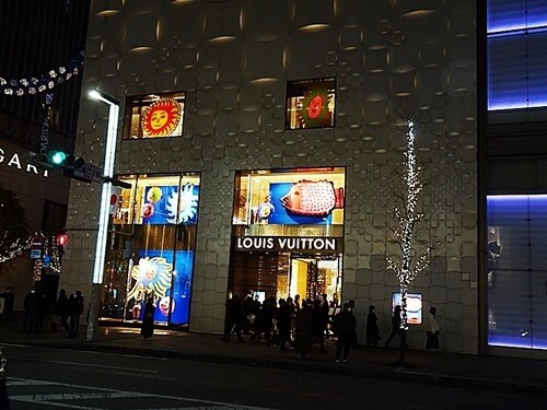 昼間に見たヨーロッパ系のブランド店に照明が点り、昼間とは違う顔を見せてくれる。