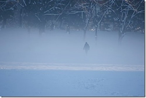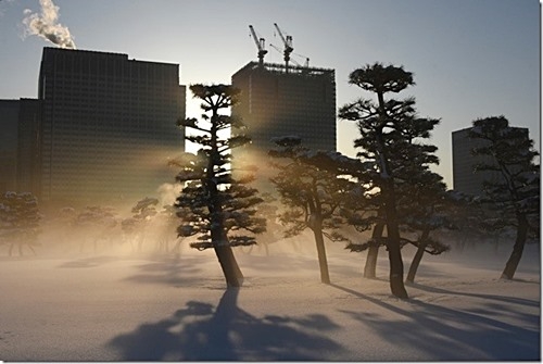 ここからは皇居内の宮内庁々舎に向かった関係者の車の轍を頼りに、ソロソロと歩いて行く。丁度、太陽が昇って来たので、光で温められた雪からモヤが立ち上って霞が掛かって幻想的な光景が出現している。「早起きは三文の徳」を実感する。
