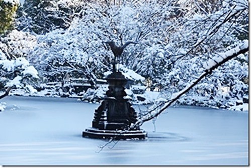 鶴の噴水は凍っていなかったが、昨夜の大雪で池はシャーベット状になっていた。