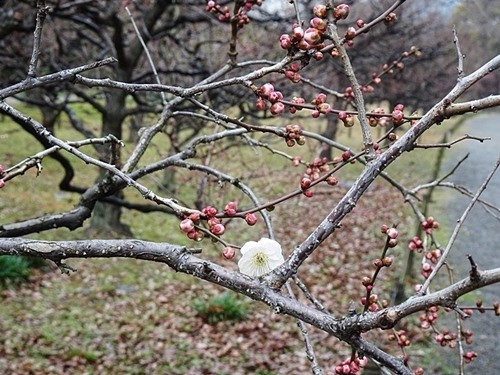 やっと見付けた梅林で、たった1本だけ花が咲いている小さな斜めになった梅の木を見付けた。「標準木」の名札も付いていなかったが、これに間違いないと思った。