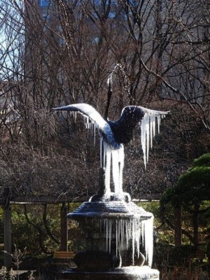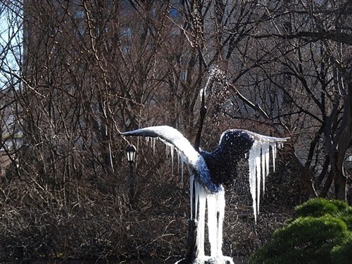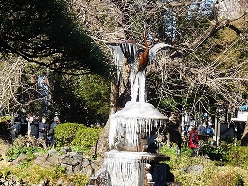 私は池の周りを歩きながら、色々な角度で撮影した。噴水が凍ったのは5年ぶりかもしれない。