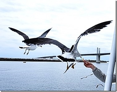 食後は小名浜港から湾内クルーズである。ウミネコの餌やりが売り物らしい。