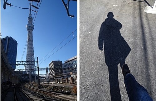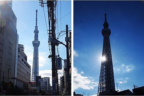さて歩き出したはよいが、「たった1駅だから」と近くに見えた「東京スカイツリー」は思ったより遠い。自分が東西南北の「どちら方向に向かっているのか」が分からない。角を曲がってみたら、東京スカイツリーの中に太陽が入って光っていた。